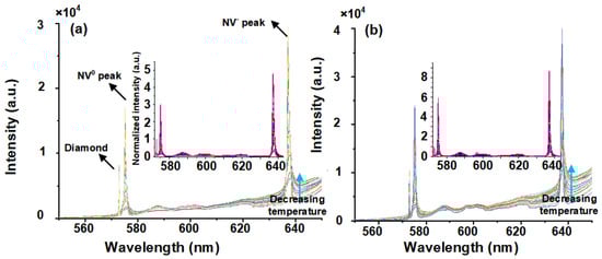 In order to give a clear view, two peaks for N-V0 and N-V− were magnified by cutting the spectra ranged from 579 to 634 nm, which did not affect the analysis of these two peaks, as shown in Figure 5a,b, respectively. The emission intensities at each temperature point were sampled out from these two results and are shown in Figure 5c,d. The emission intensities of N-V0 and N-V− decreased with increasing temperature and the degree of enhancement had a slight decreasing tendency with increasing temperature, which may be ascribed to the lower signal-to-noise ratio caused by phonon vibration interference at high temperature.