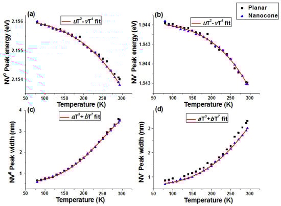 Upon cooling, peak shifts and broadening of both N-V0 and N-V− were observed in these spectra. In order to gain deep insight into the N-V center emissions in planar and nanocone diamonds, the peak position shifts and widths of N-V0 and N-V− ensembles at different temperatures were investigated, as shown in Figure 6. Two charged state N-V centers had similar temperature dependence behaviors. Since the peak position is related to the electronic transition, the nm position unit was transformed to an eV energy unit. From the position shift results, it can be seen that the N-V0 and N-V− positions redshifted with increasing temperature. The shrinkage of emission peak redshifts from 80 K to room temperature equaled 1.956 and 3.036 meV for N-V0 and N-V− centers, respectively, which were close to the results from previous work [32]. It is thought that the redshift is related to the narrowing of the diamond bandgap. In diamond, the temperature dependence of the bandgap, Eg (T), can be described by the following empirical relation [33]: