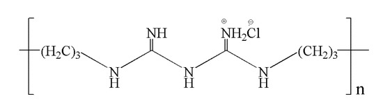 Polyhexamethylene biguanide (PHMB) is a widely used polymeric antibacterial agent due to its low toxicity and broad-spectrum biocide property, which has been commercially available in the market [15,26]. It is usually used as a biocide, and is also an important drug used in several topical applications. PHMB is composed of repeated basic biguanidine units connected by hexamethylene hydrocarbon chains, providing a cationic and amphipathic structure (Figure 1). The antibacterial activity of PHMB depends on the molecular structure, which increases with the level of polymerization, and the maximum biocidal efficiency is obtained when the hexamethylene group is employed as the spacer [16]. Biguanides in the PHMB molecules account for the inhibition and binding activities of PHMB.