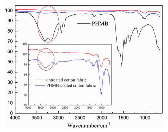 FTIR analysis was conducted to confirm the presence of PHMB on the treated cotton fabric, as shown in Figure 3. A sharp and strong absorbance peak at 1550 cm−1 was observed in the spectrum of PHMB, characteristic of imine group. The broad double peaks at 3195 cm−1 and 3380 cm−1 are ascribed to stretching vibration of –NH- and –NH2- of PHMB molecule. Compared to PHMB, the absorption spectrum of cellulose is pretty weak, particularly for the untreated control cotton fabric. As shown in the insert, the characteristic peak of cellulose at 3330 cm−1 becomes stronger after coating with PHMB, which demonstrates that PHMB was successfully coated on the cotton fabric.