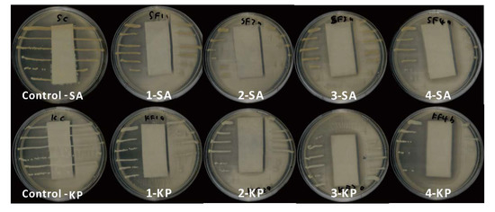 In order to explore effects of PHMB on the antibacterial activity, different concentrations were further studied (Figure 4). It can be clearly seen that all the samples treated with different amounts of PHMB show strong inhibition against S. aureus and K. pneumonia. Table 2 shows that the concentration of PHMB had a significantly positive relationship with antibacterial activity. It is noteworthy that the antibacterial activity for concentration of 2.5 and 5% was not significant. A significant antibacterial ability was seen for concentrations of 10 and 15%, however.