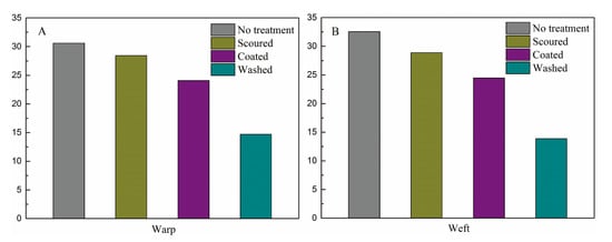 Figure 6 presents that the effects of scouring, coating and washing on tearing strength of the fabric substrate. Clearly, for the control sample, tearing strength in both warp and weft directions was found to be the highest compared to the other samples. There is an obvious reduction in tearing strength of fabric samples after scouring, indicating that scouring has a negative effect on tearing strength of fabrics. Likewise, after coating the scoured fabrics, tearing strength in the warp direction dropped from 28.44 to 24.07, whereas the weft direction saw a decrease from 28.89 to 24.45. Then, the coated fabric sample was washed 104 times and tearing strength sharply declined to 14.7 and 13.86, for warp and weft direction, respectively. The results demonstrate that scouring, coating and washing treatment have a significant negative influence on tearing strength, particularly washing.