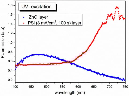 Photoluminescence (PL) is a very useful tool for the study of the electronic and optoelectronic properties of materials since PL spectra are intimately related to the band structure of semiconductors and nanostructures [21]. In this work, photoluminescence spectroscopy was used to study the light emission properties of PSi and ZnO layers to determine the bandgap of these materials. Figure 2 shows the PL spectra in the 400–750 nm wavelength range of the ZnO and PSi layers, which were taken using an excitation wavelength of 225 nm (UV excitation). Since both the PSi and ZnO layers were grown onto silicon substrates, the experimental PL data were normalized to the silicon spectrum.