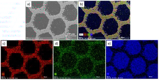 To fabricate ZnO + PSi micropatterns, regular hexagonal thin film structures of ZnO (line widths—190 µm) were grown on crystalline Si substrates. Spongy PSi nanostructures (shown in Figure 3c) were subsequently fabricated by electrochemically etching the exposed Si areas between the ZnO micropatterns. FESEM combined with EDX were used to determine the elemental composition map of the ZnO + PSi surface micropatterns. The results are presented in Figure 4. An interwoven image of all the elemental composition of the system is shown in Figure 4b. In detail, Figure 4c–e displays the Zn, O, and Si surface distributions. Map 4d shows that the largest percentage of O atoms is located in the ZnO film areas due to the oxygen vacancies in the ZnO layer, as discussed in Section 3.1. These results show that the ZnO and PSi areas are well defined with minimal mixing. This will help avoid any influence of one material on another for photoluminescence, as is the case for ZnO-infiltrated PSi films [32].