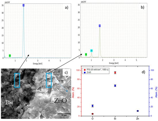 Figure 5c shows a typical FESEM image of the two regions of the sample under study, highlighting the different morphologies of PSi and ZnO. The atomic percentages of Si, O, and Zn in the two regions of the ZnO + PSi micropatterns are presented in Figure 5d. Since PSi can be described simply as an amorphous homogeneous matrix of Si nanocrystals and air, its main elements are Si and O [31]. Furthermore, the atomic percentage variations shown in Figure 5d are consistent with the surface composition maps in Figure 4c–e.