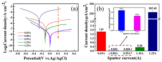 (a) Potentiodynamic polarization of TiCxOy films deposited at different sputter current in 3.5% NaCl solution; (b) Corrosion current density of TiCxOy films deposited at different sputter current at 0.2 V (vs. Ag/AgCl).