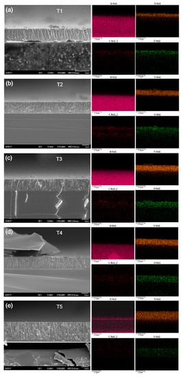 Cross-section scanning electron microscopy (SEM) images and EDS-map of T1 to T5 (a–e).