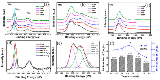 XPS spectra have a wide range of applications in film analysis, which can provide abundant physical and chemical information about the surface of materials. The XPS spectra of the TiCxOy films deposited at different target currents are presented in Figure 5. Primary peaks of C, O and Ti are all detected. The Ti2p spectra, the O1s spectra and the C1s XPS spectra, recorded from the TiCxOy films, are displayed in Figure 5a–c, respectively. Accordingly, TiC is represented by a C1s peak of 281.8 eV, so the C element exists in the form of titanium carbide in the TiCxOy films [47]. Moreover, the blue shift of C1s spectrum occurs for the TiCxOy film deposited at the target current of 0.95 A (T3), implying that some carbon diffused out from TiC to become isolated carbon and the Ti was oxidized further. Besides, The Ti2p3/2 peaks of T1, T2, T4 and T5 shift to the low binding energies at about 458.5 eV (TiO2) to further confirm the change of bonding structure variation with the adjusting of target current. The Ti2p and O1s peaks are decomposed into three peaks, according to References [48,49]. The Ti2p spectrum (Figure 5d) could be deconvoluted into three spin-orbit components under binding energies of 455.9, 456.7 and 458.5 eV and are identified with TiO, Ti2O3 and TiO2 fractions in the film, respectively [48]. One can conclude that Ti2O3 is the dominant surface state. Furtherly, O1s spectrum (Figure 6e) can be decomposed into three bands at 528.3, 530.08 and 531.1 eV, in correlation with TiO, Ti2O3 and TiO2 fractions in the film, respectively [48]. The deconvoluted result of O1s and Ti2p are consistent with each other and the collected values of Ti2O3/(TiO + Ti2O3 + TiO2) ratio of TiCxOy films deposited at different target current are described in Figure 6f. From the samples of T1 to T5, the percentage of Ti2O3 binding structure in the TiCxOy films is 37.1%, 42.1%, 49.1%, 40.6% and 26.7% for T2p and 39.1%, 41%, 51.8%, 32% and 26.2% for O1s, respectively. Both T2p and O1s results show a highest Ti2O3 binding structure the TiCxOy films deposited at 0.95 A (T3).
