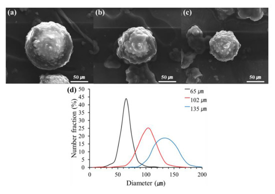 Linseed oil is widely used as a healing agent for microcapsule-type self-healing coatings due to its environment-friendly nature, good film-forming property and low cost [8,16,18,19]. Linseed oil was microencapsulated using urea-formaldehyde polymer (UF) by in situ polymerization. The morphology of the microcapsules was observed by SEM (Figure 1). Spherical microcapsules were formed at agitation rates of 1000, 1500 and 2000 rpm (Figure 1a,b,c, respectively) and the surface of the microcapsules was relatively rough. The size distributions of the microcapsules were investigated by optical microscopy (Figure 1d). The mean diameter of the microcapsules prepared at 1000, 1500 or 2000 rpm was 135, 102 or 65 µm, respectively. The microcapsules were not sieved by size and used as-prepared.