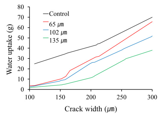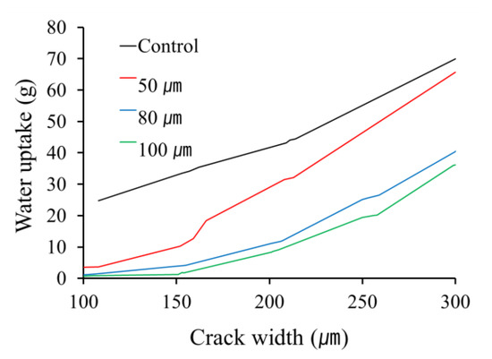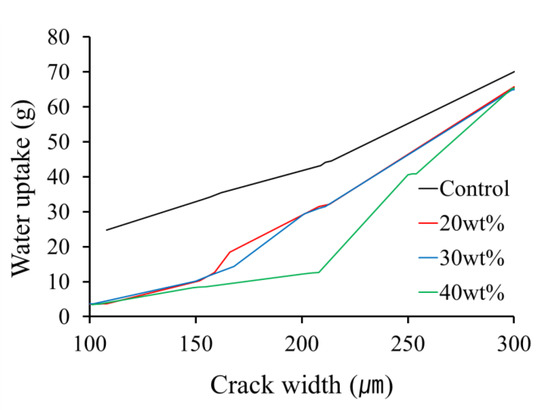 Water uptake versus crack width of the self-healing coatings with capsule-loading of 0 (control), 20 wt%, 30 wt% and 40 wt%. Mean diameter of the microcapsules and undercoating thickness were 65 µm and 50 µm, respectively.