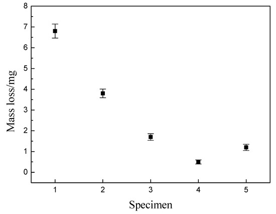 Figure 5 compares the mass loss of each coated specimen after the dry friction test. It is observed that Specimen 1 coated on substrate without pre-treatment has the maximum wear loss weight. A reduction in mass loss of more than 30% was observed for the DLC films deposited on PU rubber with pre-treatment compared to the rubber without pre-treatment. Meanwhile, with the increase in temperature and time of ultrasonic treatment in tetrachloroethylene, the wear loss of different deposited specimens first decreases and then increases slightly. Among the five coated specimens, Specimen 4 has the smallest mass loss, which was consistent with the results of the tribological tests.