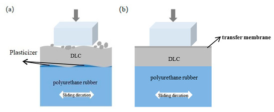 Another major difficulty in the preparation of the DLC film on polyurethane rubber is plasticizing additives in the rubber. Due to friction heating, the plasticizer will melt and precipitate out gradually, resulting in a sudden stress concentration between the film and the substrate. Then the high stress causes the film to crack and peel off [18]. It is of significance for avoiding the precipitation of the plasticizer, improving the binding ability between the DLC film and polyurethane rubber in the process of friction. In order to achieve this, an additional pre-treatment and after-treatment can be applied, which are common techniques in the coating industry [19,20].