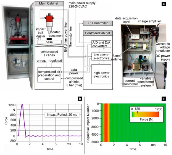In the conducted investigations an electro-magnetic impact tester, manufactured by the Impact-Bz Ltd. (London, UK) was used for acting repetitive loads on the coated specimens [] (see Figure 1a). Using this device, impact times of less than 1 ms and strain rates of about 200 s–1 can be realized. The power supply module supports the whole arrangement. The output voltage is fully controllable, with the aid of a variable transformer for adjusting various impact force amplitudes. A personal computer (PC) equipped with a PID (proportional-integral-derivative) controller supervises the whole experimental procedure. The time course of an impact force signal at 1200 N is illustrated in Figure 1b. The signal grows almost linearly versus the impact time, reaching its maximum value at approximately 0.45 ms impact time. This time course remains constant in the sequential impacts, as can be observed in Figure 1c. The impact time of the applied forces in the conducted impact tests was held constant and approximately equal to 0.45 ms. This time is practically equal to the corresponding one exercised on the considered machine elements during their operation.