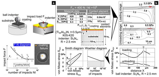 During the impact test the ball indenter penetrates periodically into the coating under a desired maximum load as exhibited in Figure 2a. Depending on the impact load and on the number of impacts, a coating failure may occur. Hereupon, under a critical force, no coating failure after 106 impacts develops, as presented in the diagram (see Figure 2a). Furthermore, a Wöhler-like diagram can be determined, as illustrated in Figure 2b. The shadowed region of this diagram is associated with the coating continuous fatigue endurance stress. The stress–strain data of this physical vapor deposited (PVD) film, as well as those of the cemented carbide substrate, are shown in Figure 2b. The axisymmetric FE model for calculating the coated surface response was developed on the platform of the ANSYS software (Release 10.0, ANSYS, Inc., Canonsburg, PA, USA), as described in reference []. For meshing the two-dimensional geometry of the carbide ball, coating and substrate plane elements were employed. Appropriate contact elements with variable stiffness csx, csy in normal and tangential directions, respectively, were applied, to consider the coating adhesion. These contact stiffness data correspond to the stiffness of a well-adherent coating on a ground and micro-blasted substrate []. With the aid of calculations based on this FE model, the stress fields developed in the coating during the loading and unloading impact test stages were obtained. In the presented case, the film damage due to fatigue starts at the intensively stressed area in the vicinity of the formed imprint. Considering these results, the coating Smith- and Wöhler-like diagrams, illustrated in Figure 2b, are then created. The coating fatigue endurance limit in the demonstrated coating case amounts approximately to 2.8 GPa, which corresponds to an impact load of 400 N. The coating withstands a theoretically infinite number of impacts, when it is stressed under this fatigue endurance stress.