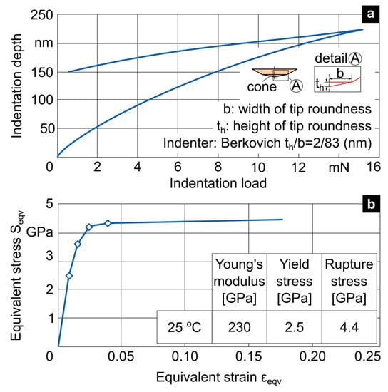 (a) Nanoindentation results on high-speed steel (HSS) at ambient temperature; (b) stress–strain curve of the HSS, attained via a finite element method (FEM)-supported evaluation of the nanoindentation results.