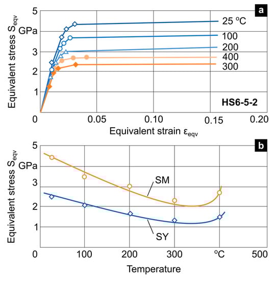 (a) Stress–strain curve of the applied HSS, attained via an FEM supported evaluation of nanoindentation results at elevated temperatures; (b) course of the yield (SY) and rupture stress (SM) of the HSS versus the temperature.