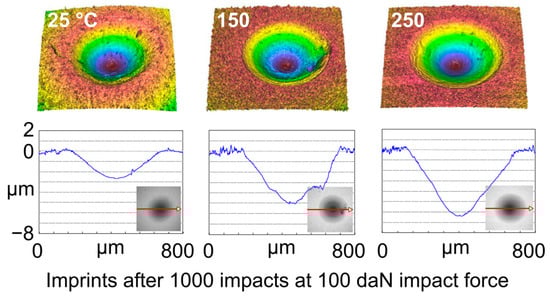 The deterioration of the mechanical properties of the high-speed steel substrate when the temperature grows, can be corroborated when observing the developed imprints after the exercise of the same impact load at ambient and elevated temperatures, as for instance at 25, 150 and 250 °C (see Figure 5). The developed imprints after 1000 impacts, due to the occurring material plastic deformation, were recorded via confocal microscopy. The progressive augmentation of the remaining imprint depth (RID) along with the increase of the temperature is visible.