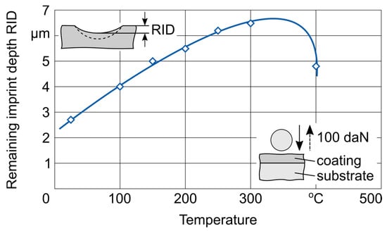 The latter RID augmentation continues up to about 350 °C. Furthermore, in the investigated temperature range, RID diminishes over 350 °C up to 400 °C, as demonstrated in Figure 6. The illustrated course of the RID over the temperature in the range from 25 up to 400 °C converges sufficiently with the corresponding course of the high-speed steel mechanical properties change versus the temperature, as presented in Figure 4b. In this way, in the case of coated high-speed specimens, loaded at a constant impact force, the coating deformation, and thus, the developed stresses and a potential coating failure depends, among others, on the test temperature. This will be further elucidated in the next sections.