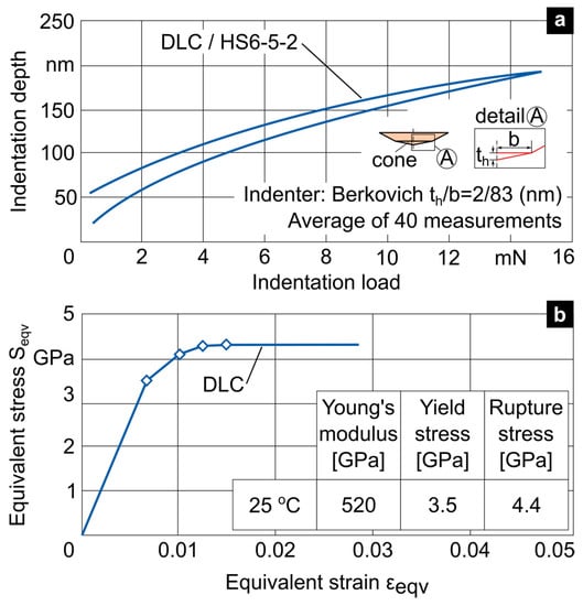 (a) Nanoindentation results on the applied diamond-like carbon (DLC) coating at ambient temperature; (b) stress–strain curve of the DLC coating, attained via an FEM supported evaluation of the nanoindentation results.