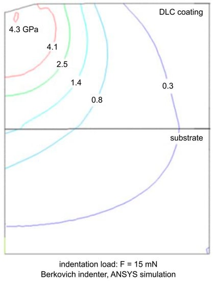 Implementing the same methodologies for determining the stress–strain data of the applied DLC coating, nanoindentations were carried out, as described in the previous section. The related results at ambient temperature are presented in Figure 7a. Via the evaluation of these results, the stress–strain curve of the DLC coating demonstrated in Figure 7b was defined. For minimizing potential inaccuracies, originating from the FEM supported determination of the temperature-dependent substrate yield and rupture strength, in contrast with its modulus of elasticity which remains practically constant in the temperature range between 25 and 400 °C (see Figure 4), the maximum indentation load was held at the low level of 15 mN. In this way, the substrate is only elastically deformed, as the FEM supported calculated stress field in the coating and its substrate exhibited in Figure 8 shows. Thus, when determining the coating mechanical properties at various temperatures, only the constant substrate modulus of elasticity is involved.