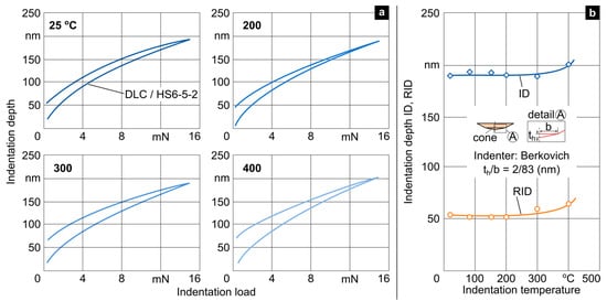 (a) Nanoindentation results on the applied DLC coating at various temperatures; (b) obtained maximum depths (IDs) and RIDs of the DLC coating versus the temperature.