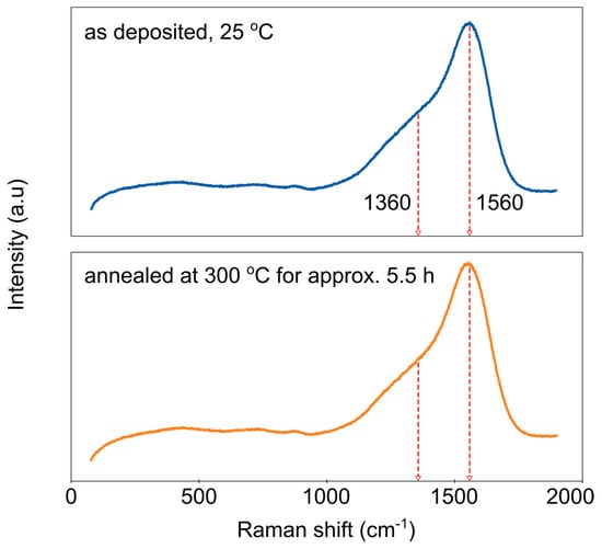 Raman spectroscopy was conducted on the as-deposited and the annealed at 300 °C DLC coatings to evaluate the nature of their carbon bonding structure (see Figure 10). Hereupon, an argon ion laser with a line of 532 nm was focused on the surface of the coatings. The measurements were repeated a few times for decreasing the noise level. The obtained Raman spectrum was curve-fitted using two Gaussian functions, peaking at disordered (D-band) and graphite (G-band) modes. The Raman spectra illustrated in Figure 10 are similar in both temperature cases. They revealed an asymmetric G band centered at approx. 1560 cm–1 and an overlapping broader D band centered at approx. 1360 cm–1. These two characteristic Raman active bands are usually observed in amorphous carbon films due to the sp2 sites, since its Raman scattering cross section is 50 times larger than that of the sp3 ones []. The G band would correspond to the symmetric E2g C–C stretching mode in all sp2 sites (both chains and rings), while the D band would be a breathing mode of A1g symmetry involving only those sp2 sites in rings []. These results show that the carbon bonding structure of the applied DLC coating remains stable in case of annealing up to 300 °C. This fact is in accordance with the unaffected coating hardness up to this temperature as described in Figure 7.