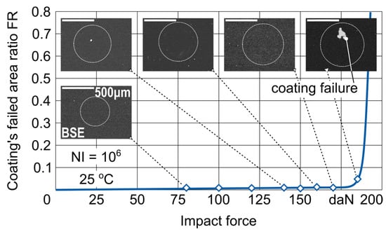 In the performed impact tests, the coating failure evolution was recorded with the aid of the failed area ratio (FR). This magnitude is defined as the ratio of the coating failed area (FA) to the contact area (CA) (crater area) between the ball indenter and the coated specimen’s surface. The coatings’ failed area (FA) within the crater area is calculated via image processing of backscattered electron analysis results, as explained in Figure 11.