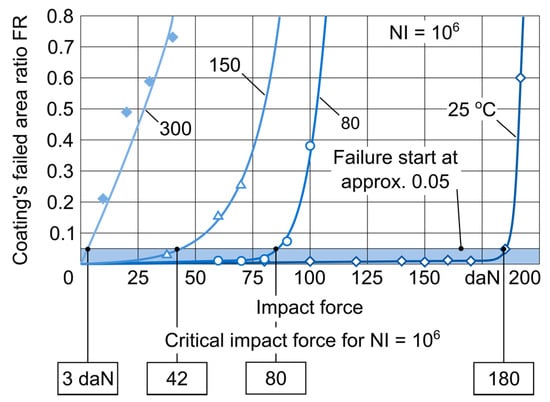 A significant reduction of the critical impact force develops, when the test temperature increases stepwise from 25 up to 300 °C, as shown in Figure 14. At the temperature of 300 °C, the DLC coating fails after 106 impacts, at impact forces of only 3 daN. After the coating failure initiation, the coating removal rate from the substrate surface is almost equally intensive in all tested temperature cases, as the curves of Figure 13 indicate.