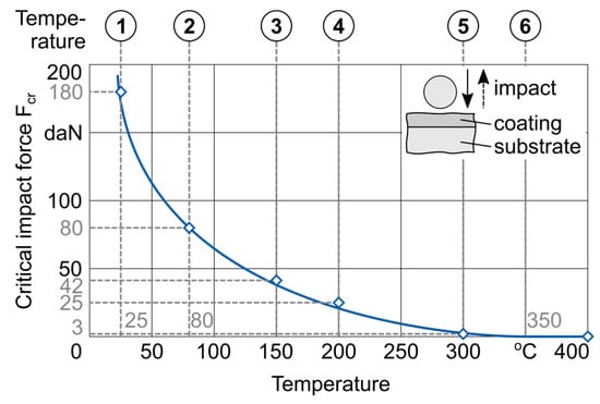 The exponential diminishing of the critical impact force versus the temperature is illustrated in Figure 14. The impact force, and thus the coating fatigue endurance at 106 impacts is practically nullified at temperatures larger than 300 °C. Using this diagram, the critical impact forces associated with the temperatures 1 to 6, as shown in Figure 14, can be determined. Hereupon, if the impact force remains constant, due to the more intensive substrate deformation when the temperature increases over the ambient one, the developed coating stresses grow too. Thus, although the coating retains its strength properties when the temperature increases up to approximately 300 °C, it might fail at a lower load, due to the substrate mechanical data deterioration and consequently larger deformation.