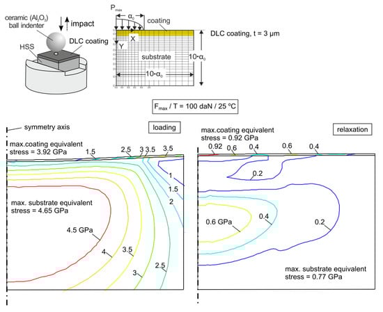 FEM supported calculation of the developed maximum and remaining stress fields in the coating and its substrate during the impact test loading and relaxation phases.