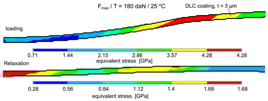Developed maximum and remaining stress fields in the DLC coating at the fatigue endurance critical force and ambient temperature.