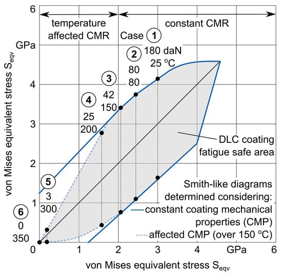 DLC coating Smith-like diagrams determined considering constant mechanical properties as well as temperature affected ones.