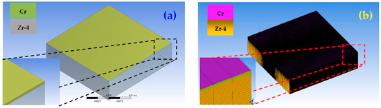 Using ANSYS software, the numerical model of the laser melting temperature field of Zr-4 alloy surface, Cr coating samples with the thickness of 7 μm were established, as shown in Figure 1, based on the laser melting process parameters as shown in Table 3. According to the overlap ratio of 40%, the overlap distance between the tracks was calculated, which was about 0.06 mm.