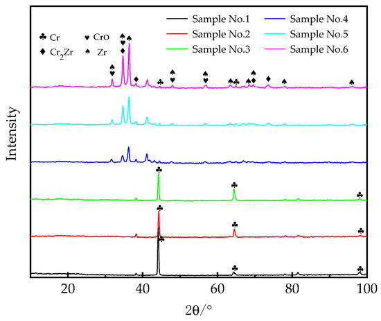 To determine phases of the coating, we performed XRD analysis (Figure 5), which indicated that the phase of the coating prepared with the lower laser energy densities (lower than 11.25 × 104 J/cm2) remains Cr without any change while the peeks of Zr, CrO, Cr2Zr are detected in the coating prepared by the higher laser energy densities (higher than 13.5 × 104 J/cm2). -Cr2Zr is formed at the temperature range from 973 and 1835 K, while -Cr2 Zr is generated between 1835 and 1895 K, and -Cr2 Zr is generated between 1895 and 1946 K. The forming of Cr2Zr indicates that laser high energy density can promote the diffusion and fusion of coating Cr and substrate Zr alloy.