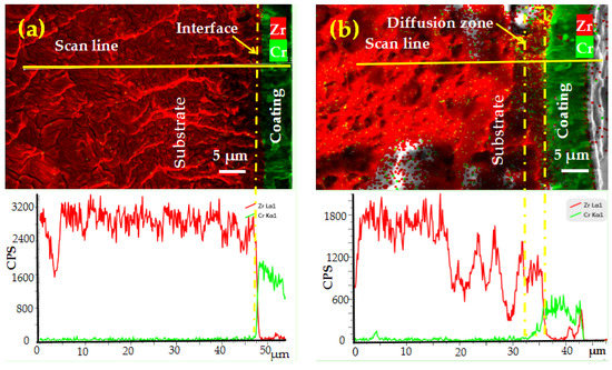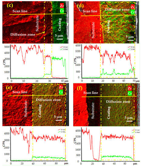 Figure 6 shows the SEM and corresponding EDS of the tensile fracture of the specimens. The element diffusion depth was calculated by scanning the element line of the sample cross section. From Figure 7, we can see that the Cr coating thickness of sample No. 1 was uniform ~7 μm, the interface between the coating and the substrate was observed clearly, indicating that the coating and substrate is physically bonded. When the laser energy density was 9 × 104 J/cm2 and 11.25 × 104 J/cm2, a Cr diffusion layer was found with the thickness of 4–6 μm near the interface of the coating and substrate which leads to the blurring of the interface, as shown in Figure 7. When the laser energy density increases to 13.5 × 104 J/cm2, Zr signals were detected on the surface of the coating, indicating that a Zr-Cr fusion zone with a thickness of 30 μm was formed, and the Cr coating completely melts and the substrate Zr partially melts, which is consistent with the simulation results. The ratio of the thickness of the diffusion layer to the whole coating of sample Nos. 1–6 was 0%, 36.4%, 46.2%, 100%, 100% and 100%, respectively. The thickness of the diffusion layer influences the oxidation resistance of the coating at high temperature.