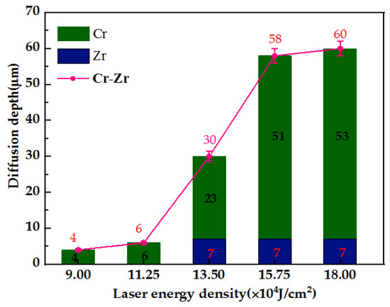 Based on the analysis of the above temperature field of the laser melting treatment, and investigating the diffusion behavior of the coating interface at different laser energy densities, we chose the laser energy density of 9 × 104 J/cm2~18 × 104 J/cm2 as the technological parameters for the preparation of the Zr-4 alloy surface protection layer, which can make the Cr/Zr interface or Cr coating micro-melt.