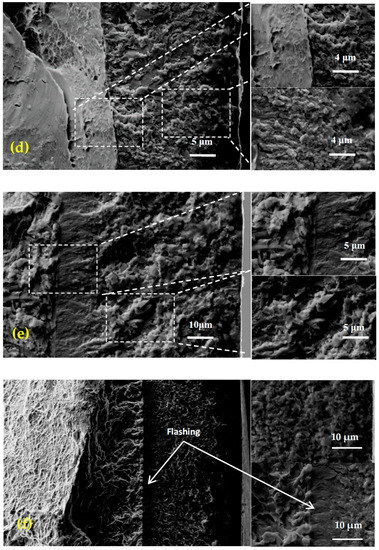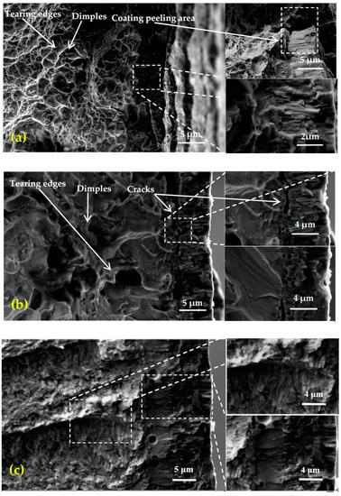 The tensile fracture of the Zr-4 alloy is a ductile fracture [19], while no dimples were observed in the tensile fracture of the chromium coating indicating that the chromium coating was brittle (Figure 8a). This is mainly due to the multi-arc ion plating Cr coating being formed by the deposition and superposition of sputtering particles. The crack distribution is at the interface of the coating and substrate in the fracture of the sample No. 2, while there is no crack in the layers of coating/substrate in sample No. 3 (Figure 8c), sample No. 4 (Figure 8d), sample No. 5 (Figure 8e) and sample No. 6 (Figure 8f). In addition, dimples were found in the fracture of sample No. 6 (Figure 8f), mainly because the Cr and Zr diffused at the interface of the coating and substrate prepared by the multi-arc ion Cr plating using high-energy laser, and formed an interfusion diffusion zone. At the same time, the crack originated from the subsurface layer of columnar crystal region rather than the coating surface layer of fine crystal region.