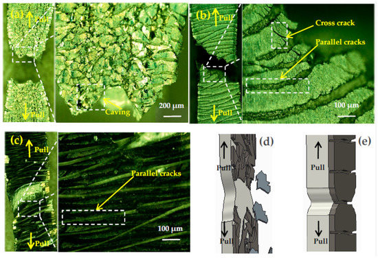 The tensile specimen coating surface morphology of sample No. 1 (a), sample No. 4 (b), sample No. 6 (c), schematic diagram of brittle fracture (d) and ductile fracture (e).