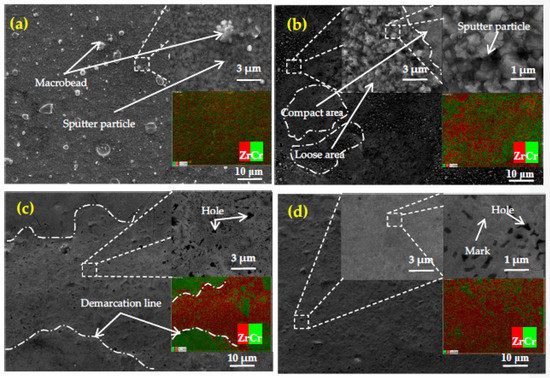 The solidified particles are observed on the surface of sample No.1 (Figure 10a) showing typical characteristics of multi-arc ion plating coating [8]. The large particles on the surface of sample No. 4 (Figure 10b) were significantly reduced. At the same time, the local area of the sample showed obvious loose areas and dense areas. Sputtering particles in the loose area have sharp edges and corners, and the number of holes and particles increase. The dense area of the coating is smooth and flat, but the original structure of sputtering particle deposition has not changed. The stronger Zr signal was detected in the dense region of the coating, indicating that the higher the effective energy density of the laser absorbed in this region, the higher the diffusion degree of Zr. The surface of the sample No. 5 (Figure 10c) is relatively flat, with no particles and smaller porosity. The strong Zr peak on the coating surface showed obvious uneven distribution, which was completely different from sample 4. Areas with a strong Zr peak are rougher than areas with a strong Cr peak due to small burrs. The coating surface of sample No. 6 (Figure 10d) is smooth and flat, with almost no holes or particles. The tiny burrs generated by Zr diffusion near the coating surface are evenly distributed, and the burrs become smaller. At the same time, it was found that the Zr peak was relatively strong and evenly distributed on the entire coating surface. However, from the locally enlarged picture of Figure 10d we can see the marks and holes left after the particles were cooled by micro-melting.