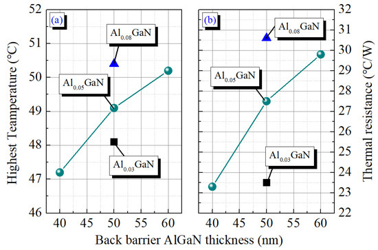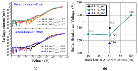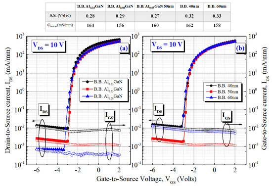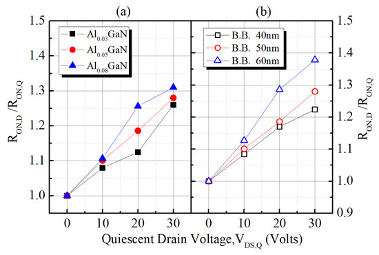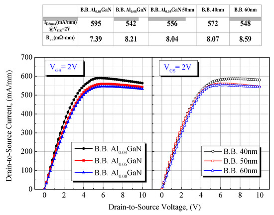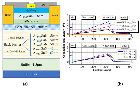 - Wang, W.; Li, L.; He, L.; Yang, F.; Chen, Z.; Zheng, Y.; He, L.; Wu, Z.; Zhang, B.; Liu, Y. Influence of AlGaN back barrier layer thickness on the dynamic RON characteristics of AlGaN/GaN HEMTs. In Proceedings of the China International Forum on Solid State Lighting: International Forum on Wide Bandgap Semiconductors China (SSLChina: IFWS), Beijing, China, 13–15 November 2016; pp. 15–17. [Google Scholar]
