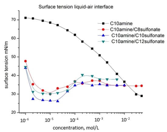 As seen in Figure 1 all the mixtures exhibit several orders of magnitude lower CMC values as compared the CMC value of the C10 amine. The lower the mixed surfactants, significantly stronger the surface tension compared to the pure systems, but the synergistic effect is strongest when their chain lengths are equal. When the total concentration of the mixtures increases, the surface tension value increases as well, thus reducing their surface activity. This can be explained with the formation of complex aggregates of both types of surfactants on the air/water interface. Shah et al. [17] report about such formations of complexes as well. They form because of the electrostatic attraction at long distance and van der Waals attraction at short distance. The higher concentration favors the formation of precipitate aggregates [56]. Overall, the strongest synergistic effect is exhibited by C10 amine/C10 sulfonate, followed by C10 amine/C8 sulfonate and C10 amine/C12 sulfonate (the weakest). To our understanding, the chain compatibility plays role here.