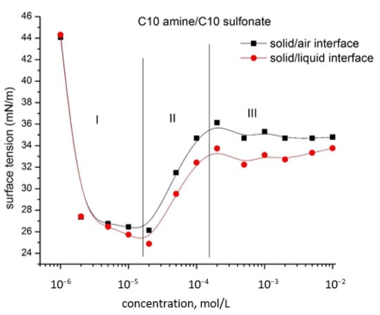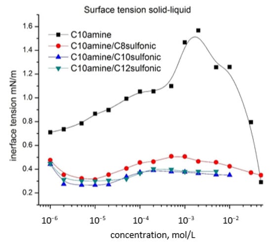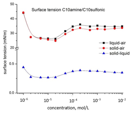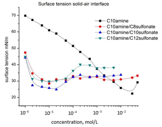 - Calculated surface tension of solid–air interface vs. concentration for C10 amine and mixed systems are close to those for the liquid–air surface, but are slightly lower. In the case of mixed systems, the graph has a specific structure similar to that of liquid–air surface dependence. Here again a synergistic effect is observed—the lowest surface tension values for the C10 amine/C10sulfonate system. At the same time, the values of the solid–liquid phase interface are significantly lower;