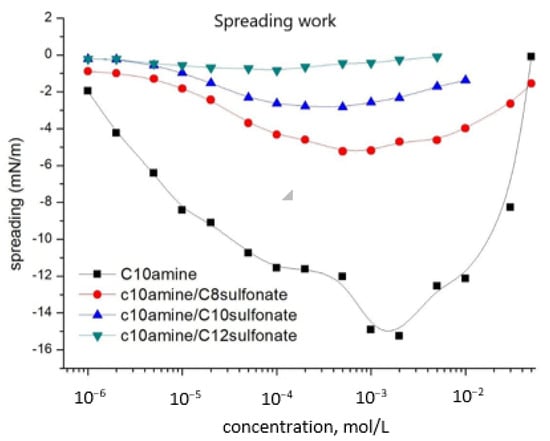- It is shown that in the whole area of concentrations the value of the work for spreading is negative. This result indicates that complete wetting does not occur. The worst are the values for C10 amine while the increase in the alkyl chain length of the sulfonates increases (algebraically) the values to positive. The best wetting is in the absence of adsorption layer (C = 0) or in a dense bi-layer.