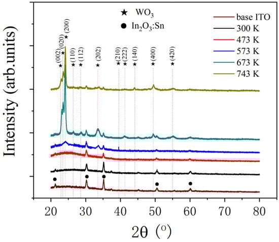 XRD was employed to determine the crystal structure and possible phase changes of WO3 thin films on different substrate temperatures, as the results are shown in Figure 1. It can be seen that there is no diffraction peaks for WO3 films at low substrate temperature of 300–473 K except for the peaks of ITO glass. The low intense peaks near 24° and 34° belonging to WO3 are observed at substrate temperature of 573 K, revealing the crystallinity transition. When the substrate temperature rises above 673 K, the positions of the reflection planes of WO3 film are 2θ = 23.1° (002), 2θ = 23.5° (020), and 2θ = 24.1° (200) corresponding to the monoclinic structure [JCPDS. 43-1035]. It can also be seen that the intensity of the Bragg reflection increases with the substrate temperature, indicating that the film has higher degree of crystallization at higher substrate temperature [20]. The results reveal that the crystal level of the WO3 can be controlled. The films deposited at 473 K are non-crystalline with amorphous properties. When increasing the temperature to 673 K, the (002), (020), and (200) diffraction appear indicating that the film grows into complete monoclinic phase crystals. Meanwhile, Scherrer formula was used to evaluate the microcrystalline size of the WO3 film, and the grain size was calculated to be approximately 12–28 nm. For the film deposited at 573 K, the wide and weak diffraction peaks at (002) and (400) indicate that the film is in a transition state between amorphous and nanocrystalline states [21].