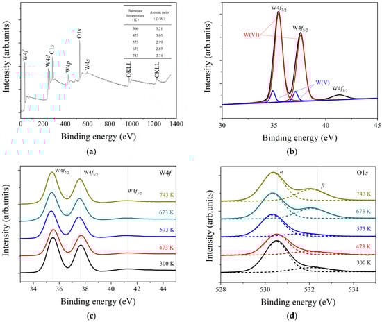 The WO3 thin films deposited at different substrate temperatures: (a) X-ray photoelectron spectroscopy (XPS) full spectra, (b) W4f Gaussian fitting peak spectra, (c) W4f spin orbit energy level spectra and (d) O1s spin orbit energy level spectra.