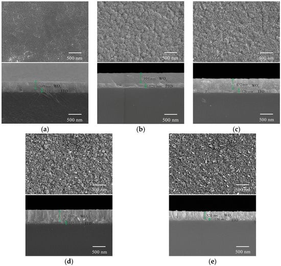 The prepared sample is an ITO and WO3 double layer film, in which the ITO as conductive layer and certain thickness of WO3 film is plated on the surface layer. The surface and cross-sectional SEM images of WO3 thin films at different substrate temperatures are illustrated in Figure 3. The literature reports that substrate temperature has a great influence on the growth of WO3 film [24]. When substrate temperature is 300 K, the film presents compact and smooth surface (Figure 3a). For the WO3 film prepared at 473 and 573 K, there is still a uniformly distributed spherical grain structure (Figure 3b,c). As the substrate temperature rises to 673 K, the spherical particles become islands and flakes (Figure 3d,e). At the same time, the crystalline state of the thin film changes, and the particle size of the thin film becomes small and flakes pile up. It also can be seen from the cross-sectional view that as the substrate temperature increases, the thin film growth leads to higher density. And the growth of the columnar crystal of the crystalline film becomes more obvious, which corresponds to the crystal orientation in the XRD pattern (200).