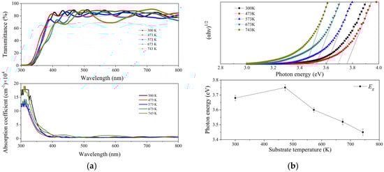 The WO3 films deposited at different substrate temperature: (a) transmittance and absorption coefficient curve and (b) Tuac plot and Eg curve.