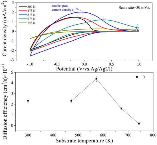 where Ip is the anodic peak current density, C0 the concentration of Li+ in the electrolyte, and ν the scan rate for CV test. As shown in Figure 6, when substrate temperature increases from 300 to 473 K the Ip increases, indicating the improved electrochemical characteristics. For the film prepared at 573 K, the CV integral curve area is the largest with the maximum anodic peak current density of 2.02 mA/cm2. After that, Ip sharply decreases. The calculated Li+ diffusion efficiency is shown in the inset of the Figure 6. According to the Randles–Sevcik equation, the maximum Li+ diffusion coefficient obtained at 573 K is 4.40 × 10−11 cm2/s, it is superior to the previous Madhavi V. literature reports that the best diffusion efficiency of the prepared film ion is 1.85 × 10−11 cm2/s. It can be attributed to the increased surface roughness and increased micro-void concentration of the film. When the substrate temperature is appropriately increased to 573 K, the loss structures between the amorphous and crystalline states can provide more effective contact area. The enhanced surface ion-implanting activity leads to an increase in the diffusion coefficient, which is in favor of lithium ion insertion/extraction [30]. However, the further substrate temperature increasing enhances the crystallinity and the formation of columnar crystal, which may cause a regular decrease in the Li+ diffusion coefficient.