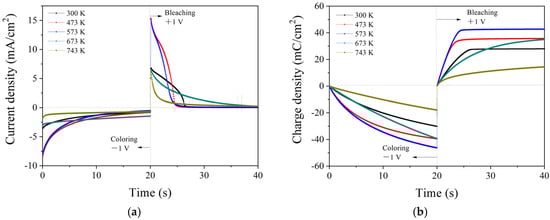 The response time which is obtained by the trend of the current density change is a main evaluation indexes for electrochromic performance. The electrochemical test is performed by applying alternative ±1 V constant potentials, Figure 7 shows constant current step current density and charge density as a function of time. The calculated coloring time (tc) and bleaching time (tb) values are given in Table 1. When the substrate temperature is 300 K, the peak value of the response of tungsten oxide is 6.8 mA/cm2 and the maximum injection charge is −30.2 mC/cm2. For film prepared at higher substrate temperature, large charge density and a short fading time were detected. The maximum response current peak density obtained at 573 K is 15.3 mA/cm2, and the injected charge density is as high as −46.4 mC/cm2. After that, the degraded electrochromic properties with low response current density, small injection amount and long fading time were received at substrate temperature of 573–743 K. This trend is more pronounced with increases temperature, which should be attributed to their different microstructures especially the crystallinity. The WO3 films with amorphous structure provide more lithium ion diffusion channels and storage space, however the regularity and compaction crystal structure will weaken their corresponding electrochemical characteristics [31,32]. Figure 7 shows that the film obtained at substrate temperature of 573 K has a maximum substrate response current density and injected charge density, which is consistent with the CV results.