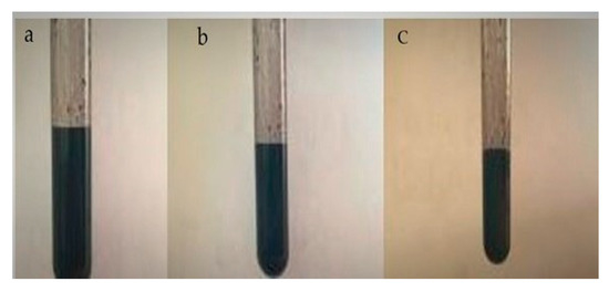 The carbonized charcoal was first crushed and grinded into fine particles. Then, the dispersion was prepared using the aqueous dispersion process. Initially, a quantity of water was poured in to a beaker along with the dispersant. Then, ethanol was added drop by drop to assist sonication and improve dispersion [8], and finally different concentrations of charcoal particles as shown in Table 5 as per the experimental design of response surface methodology by central composite design using Design expert 11 was designed. The mixture was stirred continuously using probe sonication for 15 min, and then ultrasound bath sonication was used for 30 min to obtain homogenization of well-dispersed charcoal particles [24,25]. A cross-linking agent BTCA was added to improve the wash durability of the finish [26] and MgCl2 to catalyze the reaction of BTCA. The quality of the dispersion was controlled visually allowing the dispersion weeks as settling time [6,25,27] in addition to the examination of the dispersion by the AATCC 146-2006, filter test method; dispersion evalauation procedure. When agglomerates of charcoal particles were observed, the dispersion was disqualified as insufficient and used no further. In case a homogeneous black dispersion observed, the dispersion was qualified as good as shown in Figure 1.